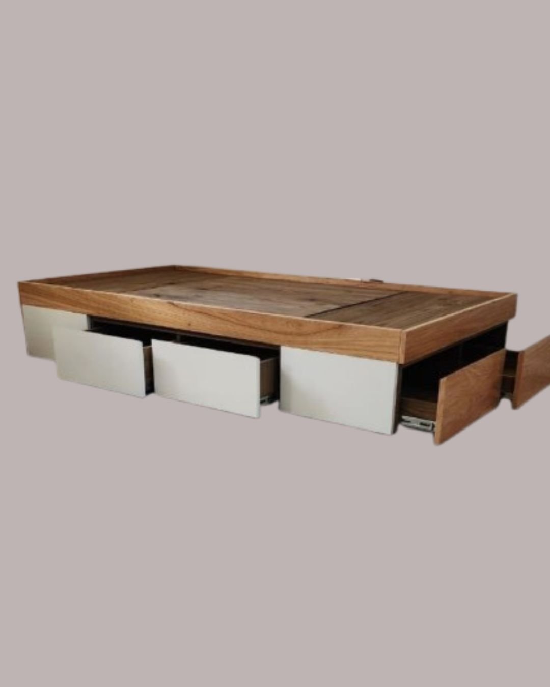 - Frentes de la cama con enchapado paraíso y melamina blanca laterales